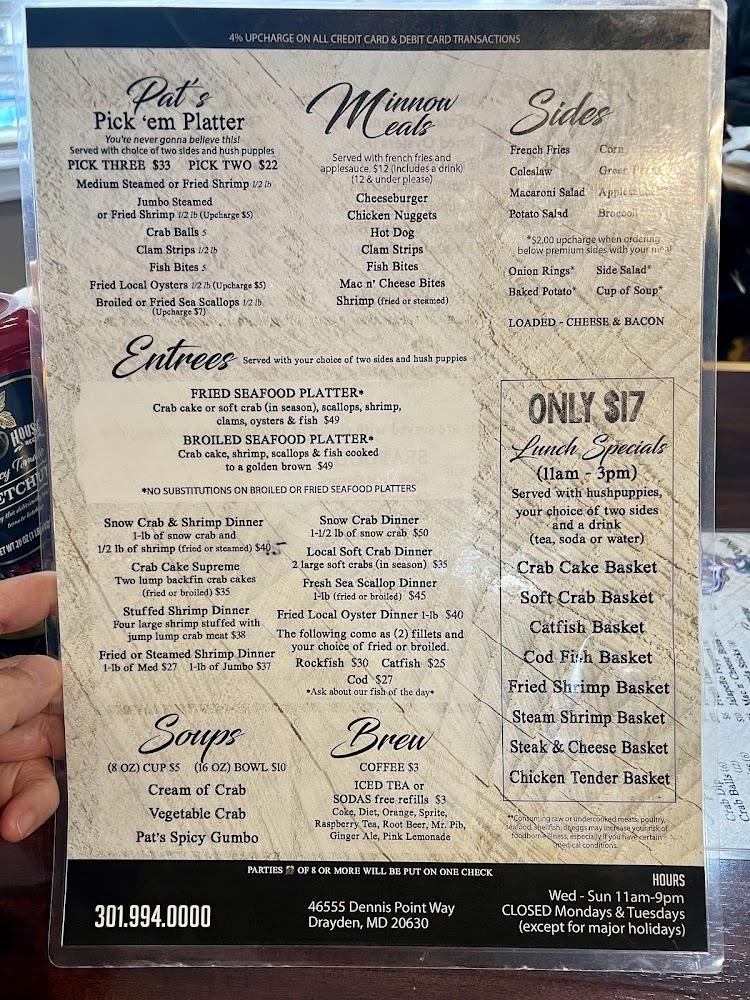 Welcome to Captain Pat's Seafood, your destination for a delicious seafood dining experience in Drayden, MD. Nestled at 46555 Dennis Point Way, our restaurant boasts a relaxed and inviting atmosphere perfect for families, groups, and solo diners alike. Enjoy our extensive menu featuring local specialties, fresh seafood, and an impressive selection of beers and cocktails. With options for dine-in, takeout, and delivery, we cater to all preferences. Our amenities include a spacious terrace and ADA-accessible features, ensuring everyone can enjoy a meal with us. Come savor the flavors of the sea and indulge in our delightful desserts!